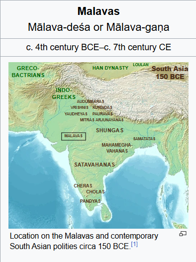 The Malavas, recorded in early texts as a martial “gana” or republican tribe, are mentioned in works such as Patañjali’s Mahābhāṣya whereby the Malava Gana is distinguished from serfs and slaves, indicating a body of full-rights tribal members governing collectively.
